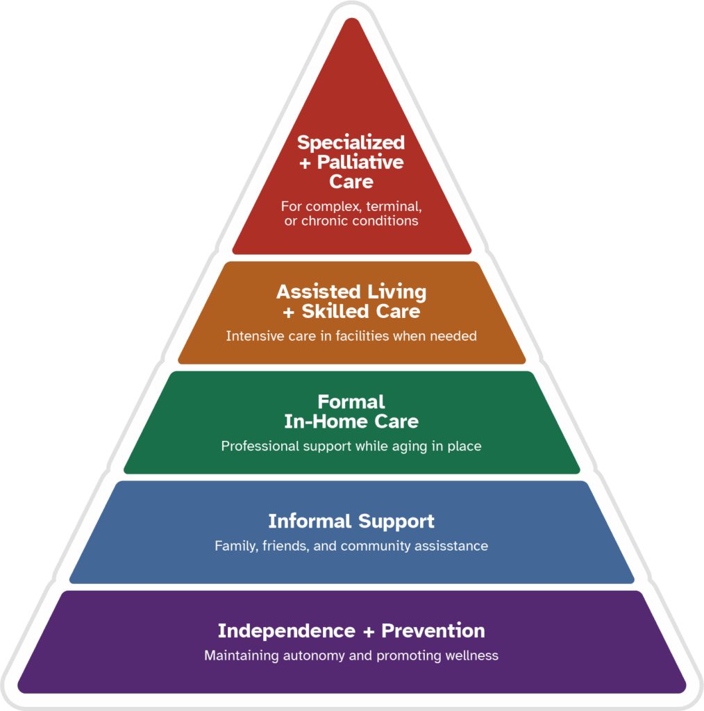 The “Up the Pyramid” approach to caregiving for our aging population is a model that emphasizes progressively increasing levels of support, autonomy, and care as individuals age or experience changes in their health and abilities. Rather than immediately resorting to institutional or high-intensity care, this approach encourages beginning with the least invasive and most independence-preserving options, moving “up” only as more support becomes necessary.